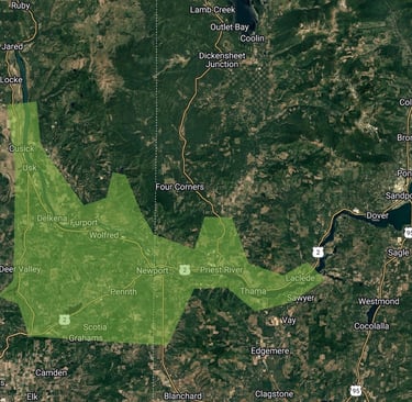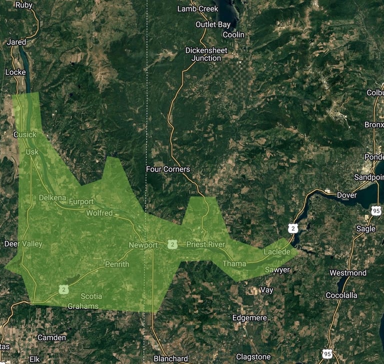 ROAM Physical Therapy currently provides in-home mobile physical therapy services to residents of Pend Oreille County, Washington, and Bonner County, Idaho located within the area highlighted in GREEN on the accompanying service area map.